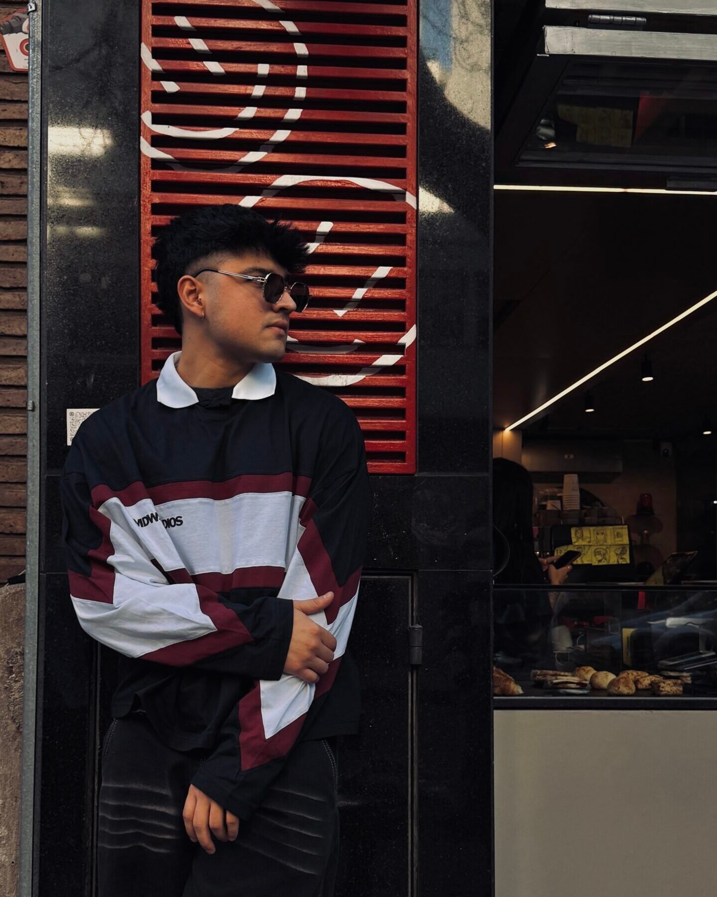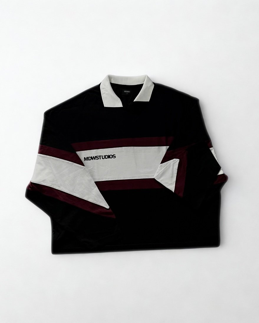 - Buzo polo boxy fit manga larga de frisa con cuello tejido y bordado en el delantero.